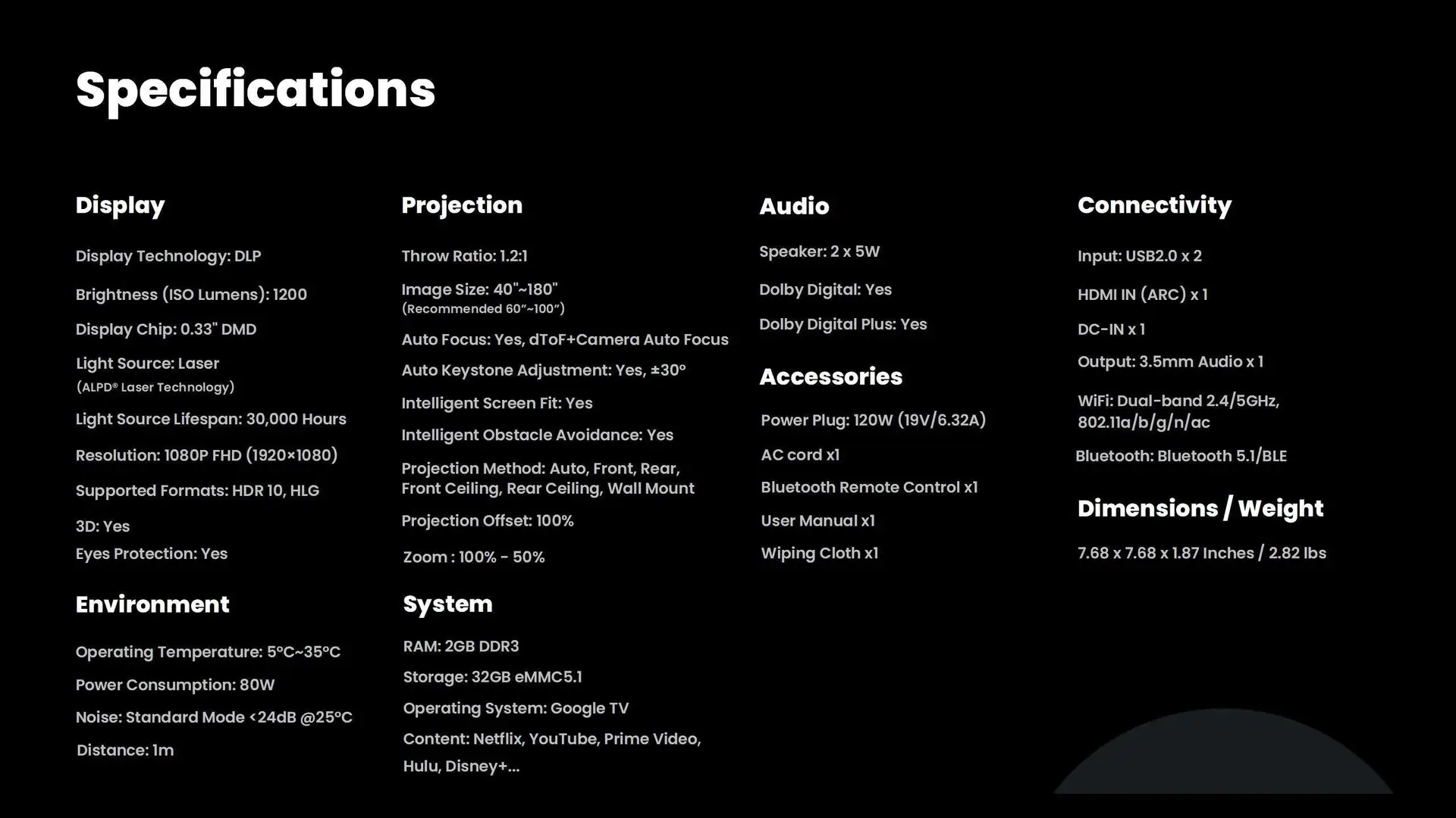 40″~180″ (Recommended 60”~100”)
