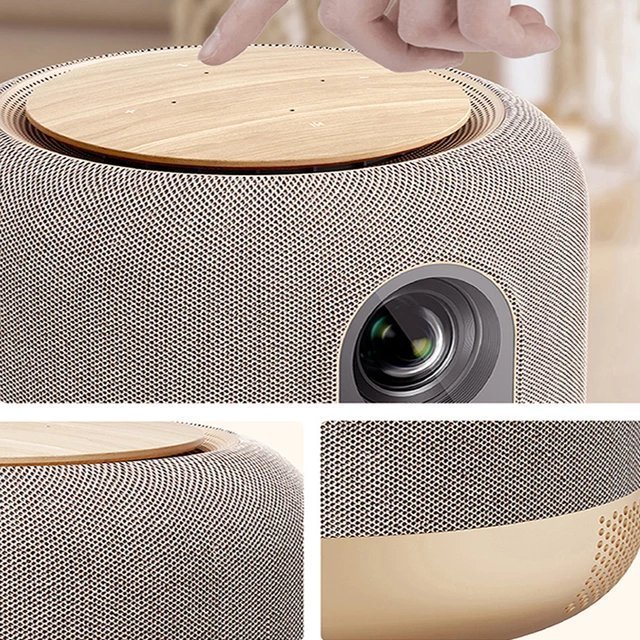 The V10 projector is not a traditional projector, but more of a smart speaker. With its gray organic fabric, black “big eyes”, bronze-colored metal-like shell and a wood grain top cover close to the color of the shell, the V10 is simple and elegant.