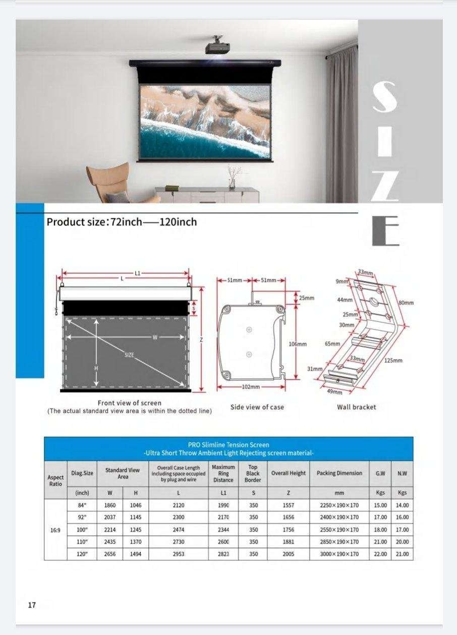 Product Name VIVIDSTORM PRO Slimline 100 – 120 inch Screen Electric Tension ceiling mount and wall mount with ALR Material Ultra-Short Throw Ambient Light Rejecting Application AD,Club, Home, Theater, School, Meeting Room, Showroom, Leisure Area Projector UST ALR Projection Screen